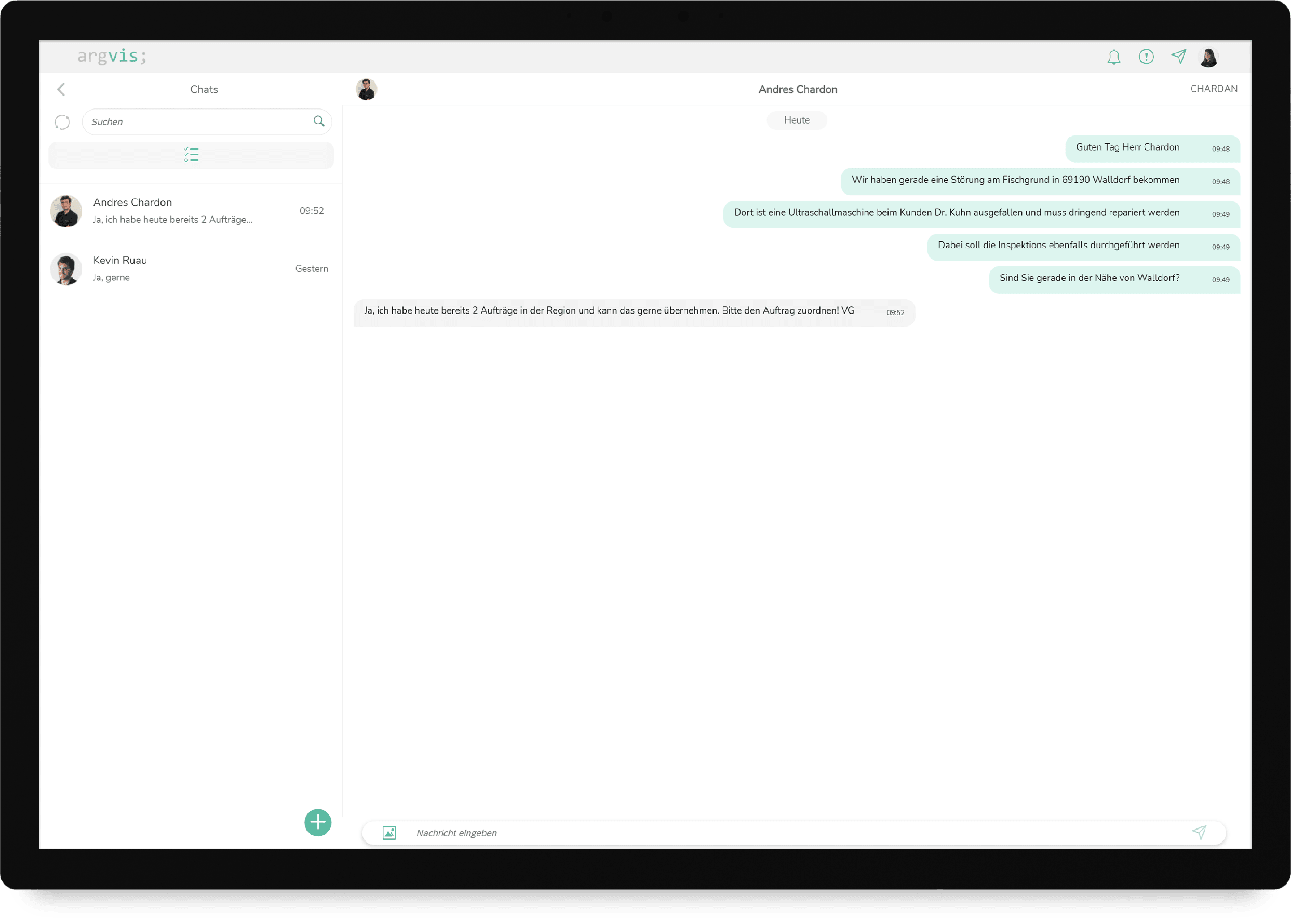 Für die meisten Besitzer von Smartphones oder Tabletts ist die Chatfunktion wie z.B. WhatsApp häufig die beliebteste App auf dem mobilen Endgerät. Bei der Nutzung dieser Anwendung hinsichtlich des Austausches betrieblicher Informationen laufen Sie jedoch Gefahr, dass Ihre firmenkritischen Informationen auf einem Server in den USA oder China landen. Vor diesem Hintergrund haben wir im argvis; Maintenance Portal eine Chatfunktion integriert, deren Informationen Ihr Netzwerk nicht verlassen. Bei dieser Anwendung können Sie wie gewohnt Textnachrichten, Bilder, Videos etc. austauschen.