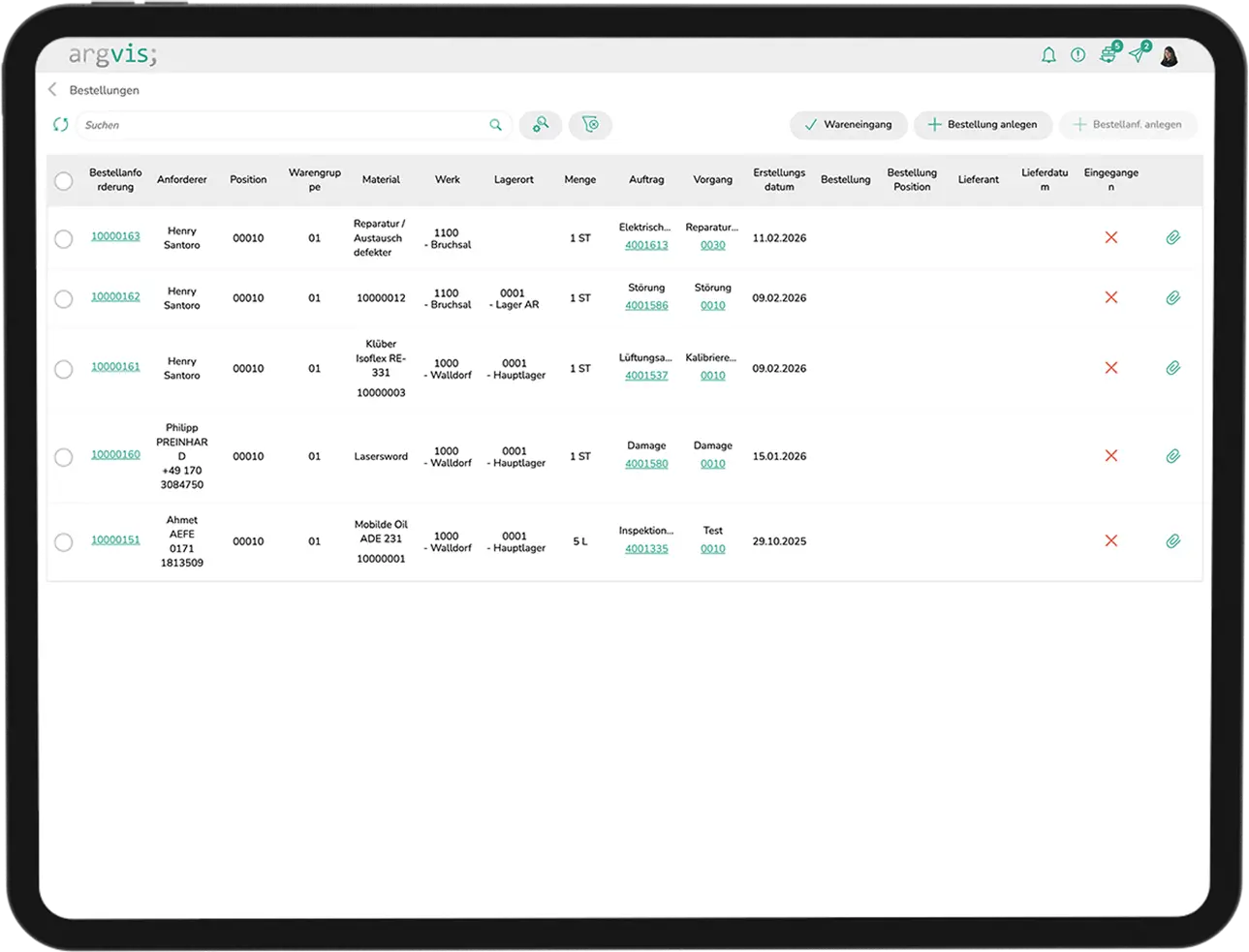 Mit den Apps Inventar, Inventur, Reservierungen und Bestellungen bietet das argvis; Maintenance Portal ein umfassendes Modulpaket für das Ersatzteil- und Lagermanagement. Alle Anwendungen sind intuitiv bedienbar, mobil nutzbar und vollständig in SAP integriert.
